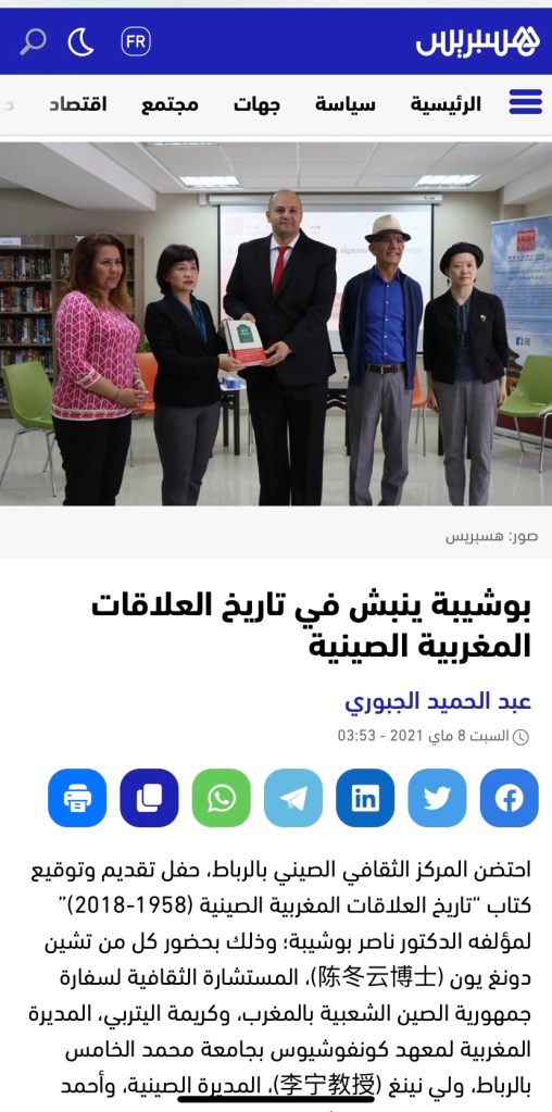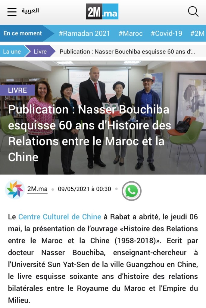Rencontre avec l’auteur dans la chaine DAFMED TV, Avril 2021Couverture médiatique en Chine par l’Agence Xinhua (Chine nouvelle) de la cérémonie de présentation et de signature du livre au Centre Culturel ChinoisPrésentation du livre au Président de l’Association Ribat Al Fath Mr. Abdelkrim BENNANI, en présence du Prof. Karima YATRIBI et Prof. LI Ning de l’institut Confucius de Rabat et et les Membres du bureau de l’association, 5 Mai 2021